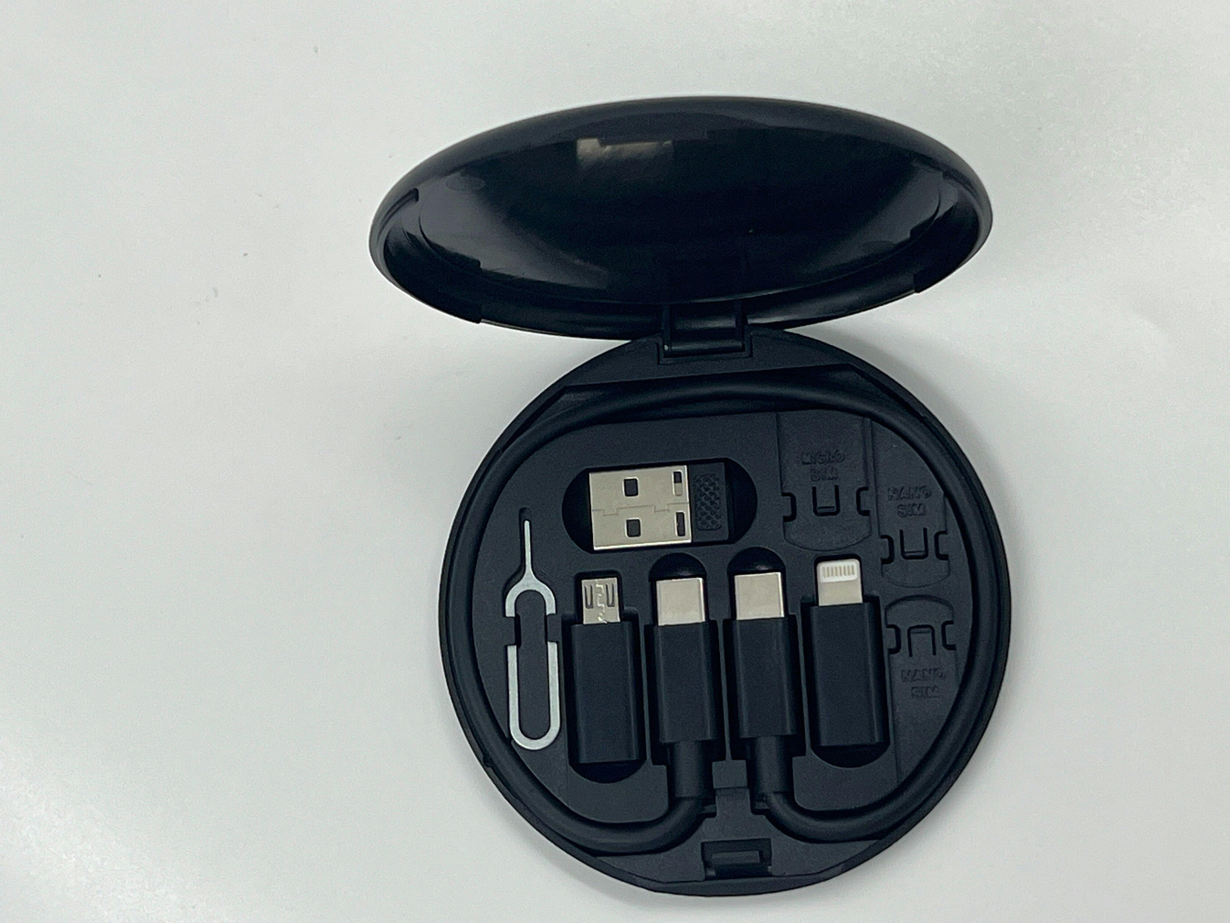 The set includes different cable types, a SIM ejector pin, and SIM card slots, all packed in a small case that also works as a phone stand. It is easy to carry, keeps your cables organized, and is perfect for travel or daily use.